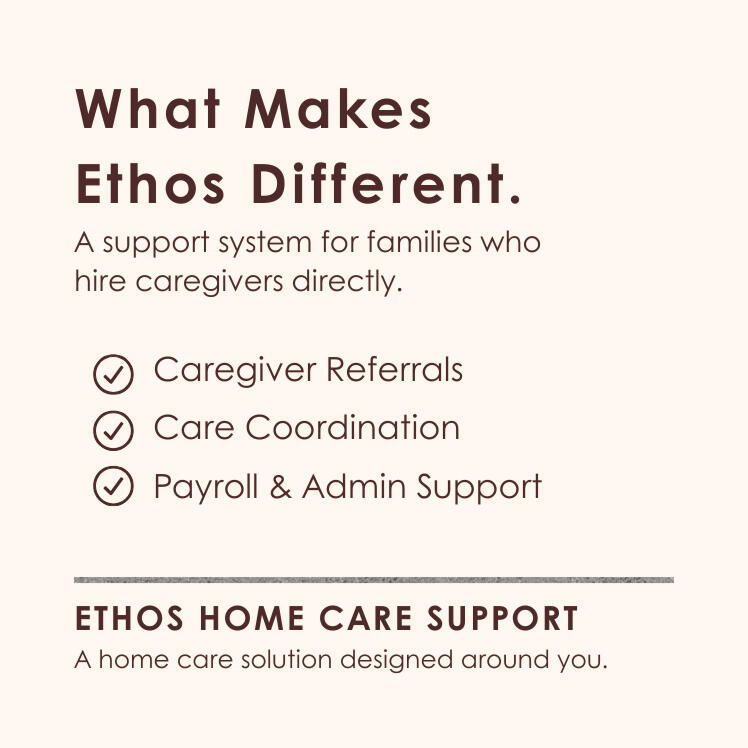 Through Ethos, we do for others what we wished had been done for us. We take the guesswork out of caregiving, ensuring that families can focus on love rather than logistics. We help manage payroll and compliance so that families don’t have to navigate the complexities of hiring a caregiver alone. We offer support, not just as professionals, but as people who understand—deeply, personally—what it means to need care from afar.